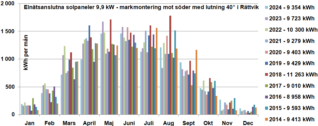 Vår installation från 2014 med polykristallina solceller har i snitt producerat 960 kWh/år och installerad kW.